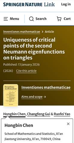 2026年1月13日,西安交通大学数学与统计学院陈红斌教授与澳门大学桂长峰教授、华南理工大学姚若飞副教授合作的论文Uniqueness of critical points of the second Neumann eigenfunctions on triangles被世界四大顶尖数学期刊之一的Inventiones Mathematicae(《数学新进展》)在线发表。这也是自2020年以来,数学与统计学院教师高水平成果第二次被四大顶刊接收发表,凸显了学校和学院在大力推进基础研究领域取得的重要突破。