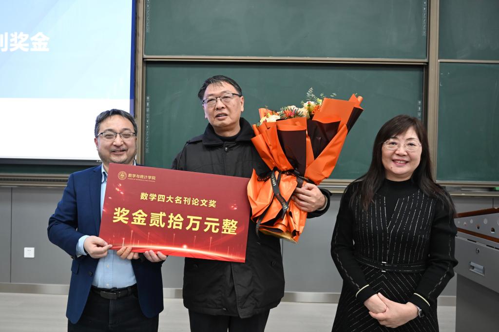 会上,颜莉书记与孙建永院长共同为陈红斌教授颁发了“四大顶刊”奖金20万元,并敬献鲜花,以表彰其在基础数学研究领域取得的卓越贡献。并勉励全院教师以陈红斌教授为榜样,潜心学术、勇攀高峰,为服务高水平科技自立自强贡献智慧与力量。