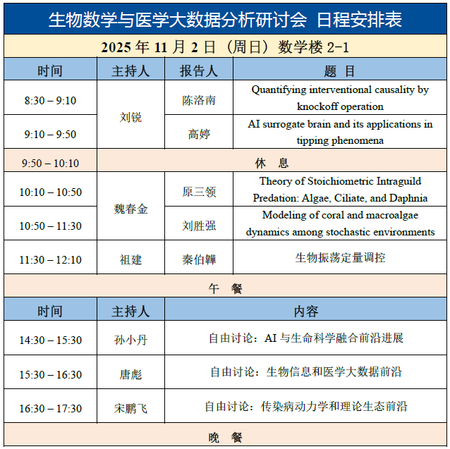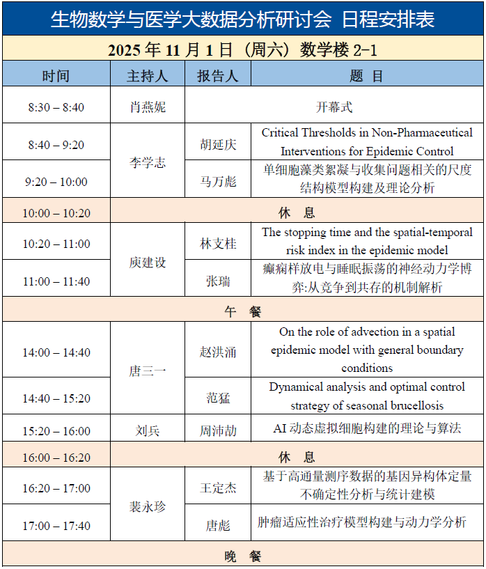 国家天元数学西北中心“第五届生物数学与医学大数据分析研讨会”将于11月1日-2日在西安交通大学举办。本次研讨会的目的是交流生物数学、生物信息学和医学大数据分析领域的最新研究成果和发展动态。围绕生命科学、生物医学、理论生态等领域的实际问题,深入探讨数学、统计学与数据科学最新成果在生物、生态和医学等系统理论研究中的重要作用,通过问题驱动的理论研究促进生物数学、生物信息学和大数据科学的理论发展,提升采用统计与计算方法分析处理生物医学、生态学、农学等领域实际数据的能力。此次研讨会将为参会人员搭建学术交流、科学研究、合作分享的平台,为动力系统、微分方程、生物数学、生物统计与信息学、公共卫生和医学等方向的硕士生、博士生、博士后和青年教师提供良好的学习机会和交流平台。