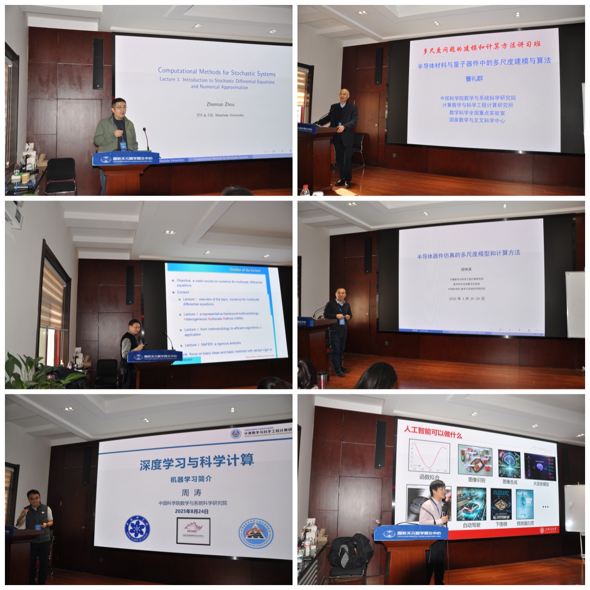开幕式后,讲习班共设置6门课程,邀请了偏微分方程数值计算与多尺度建模领域的知名专家授课。西湖大学周珍楠研究员讲授了随机微分方程理论、Langevin动力学采样以及随机梯度下降与方差缩减技术,为随机系统的计算提供了系统的方法;中国科学院数学与系统科学研究院曹礼群研究员围绕半导体材料与量子器件的多尺度建模及算法展开讲解,涵盖了热、电磁及量子器件等应用场景;明平兵研究员系统介绍了异质多尺度方法、广义有限元方法的设计思想与理论分析;郑伟英研究员聚焦漂移扩散、量子校正、泊松—薛定谔方程等多尺度半导体器件模型,详细阐述了数值方法的设计思路及稳定性、保正性分析;周涛研究员围绕深度神经网络在偏微分方程逼近中的应用,讲授了自适应深度采样、概率密度逼近及高维PDE深度学习等前沿内容;上海交通大学许志钦教授阐释了神经网络训练中的频率原理和凝聚现象,并展示了其在Fokker-Planck方程与多尺度微分方程中的实际应用。