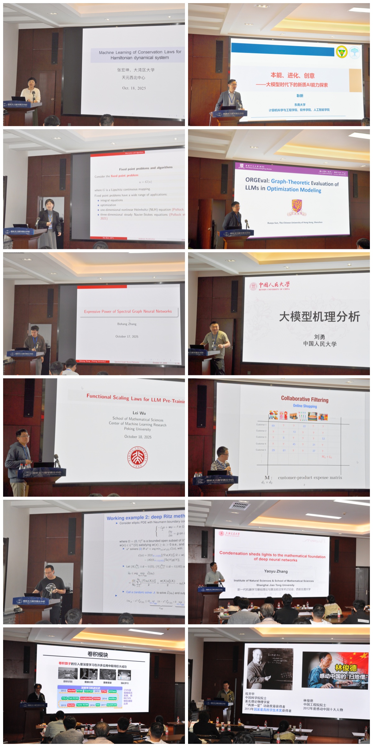 在专家报告环节,大湾区大学张宏坤教授、东南大学耿新教授、哈尔滨工业大学边伟教授、香港中文大学(深圳)孙若愚副教授、武汉大学焦雨领教授、上海交通大学张耀宇副教授、中国人民大学刘勇副教授、北京大学吴磊助理教授、香港科技大学夏冬副教授、西北核技术研究所张俊杰副研究员、北京大学张博航博士、西安交通大学谢琦副教授分别作了专题报告。内容涵盖了大模型时代下的AI能力探索、大语言模型在优化建模中的图论评估、谱图神经网络表达能力、Transformer理论、能量视角下的架构设计、大模型尺度现象的动力学机制、低秩模型学习与推断、神经网络的数学基础以及几何等变先验嵌入的模块设计等多个前沿方向。与会学者围绕报告展开了深入交流,在思想碰撞中激发新的研究灵感与合作契机。